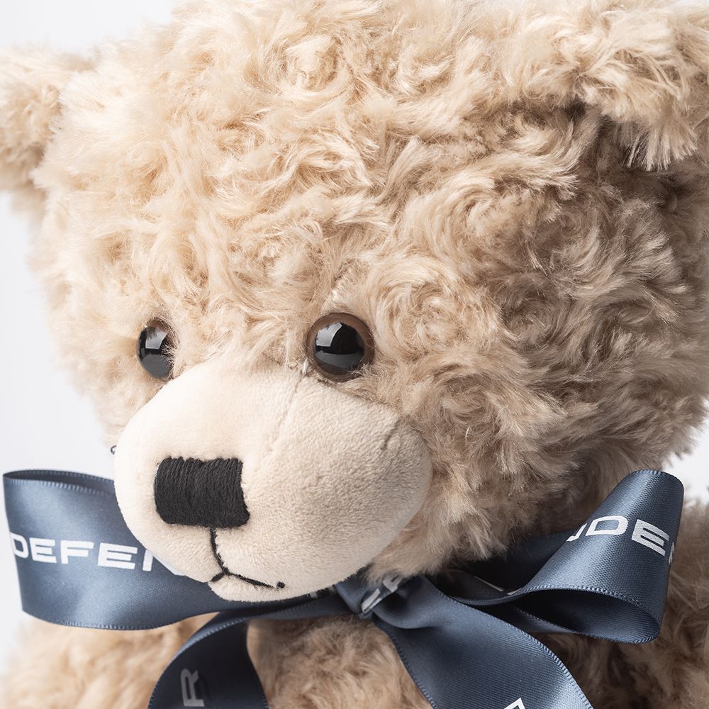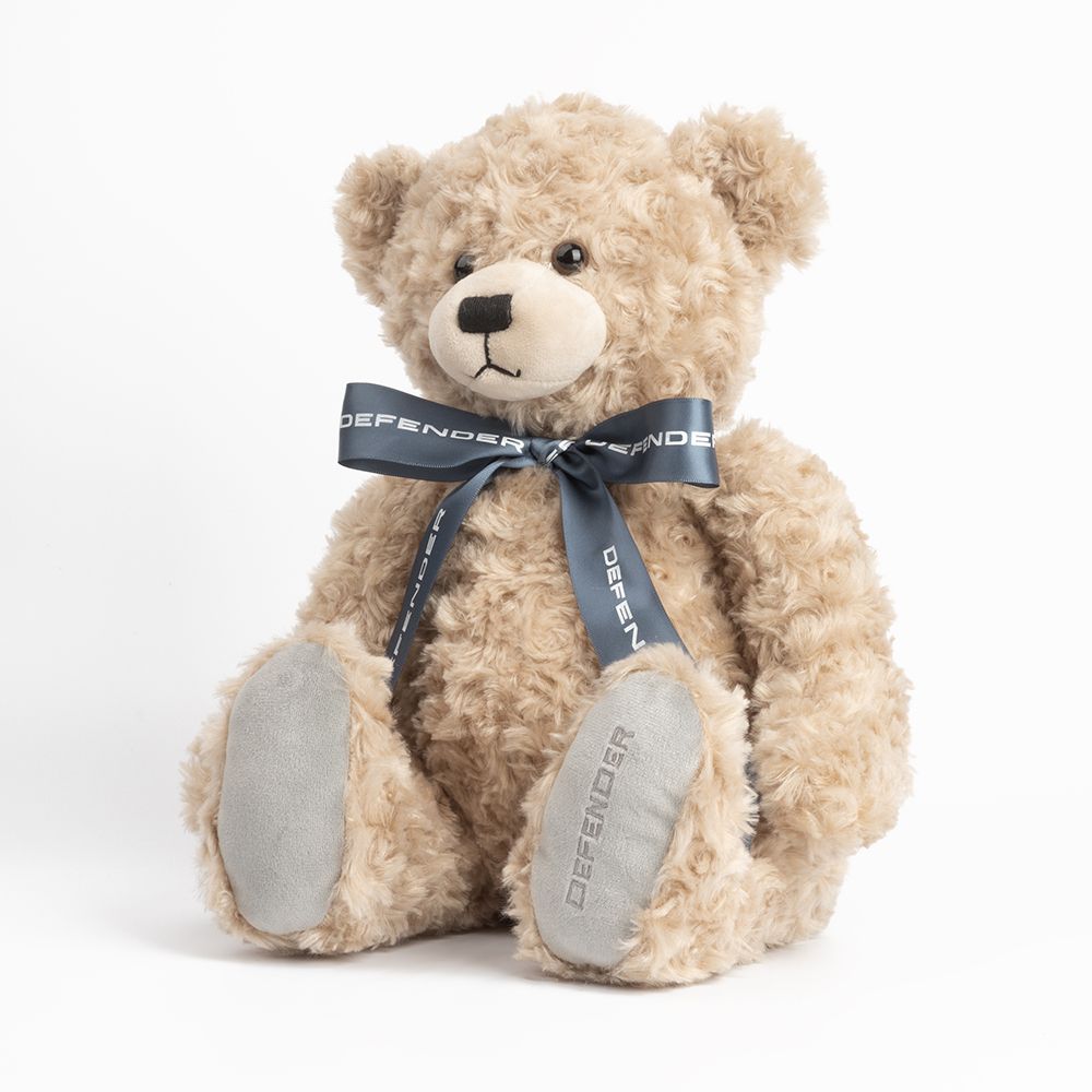 とても柔らかなファー生地のテディベアです。ブランドロゴ入りのリボンタイと、足裏パッドに刺繍されたディフェンダーのワードマークが施されてます。手洗いのみ。