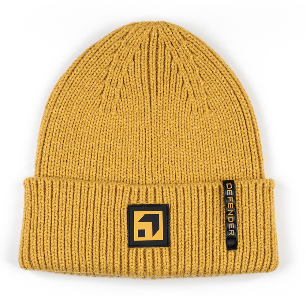 ディフェンダートロフィーエディションの伝統的な色であるサンドグローイエローのニット帽スタイルビーニーです。
