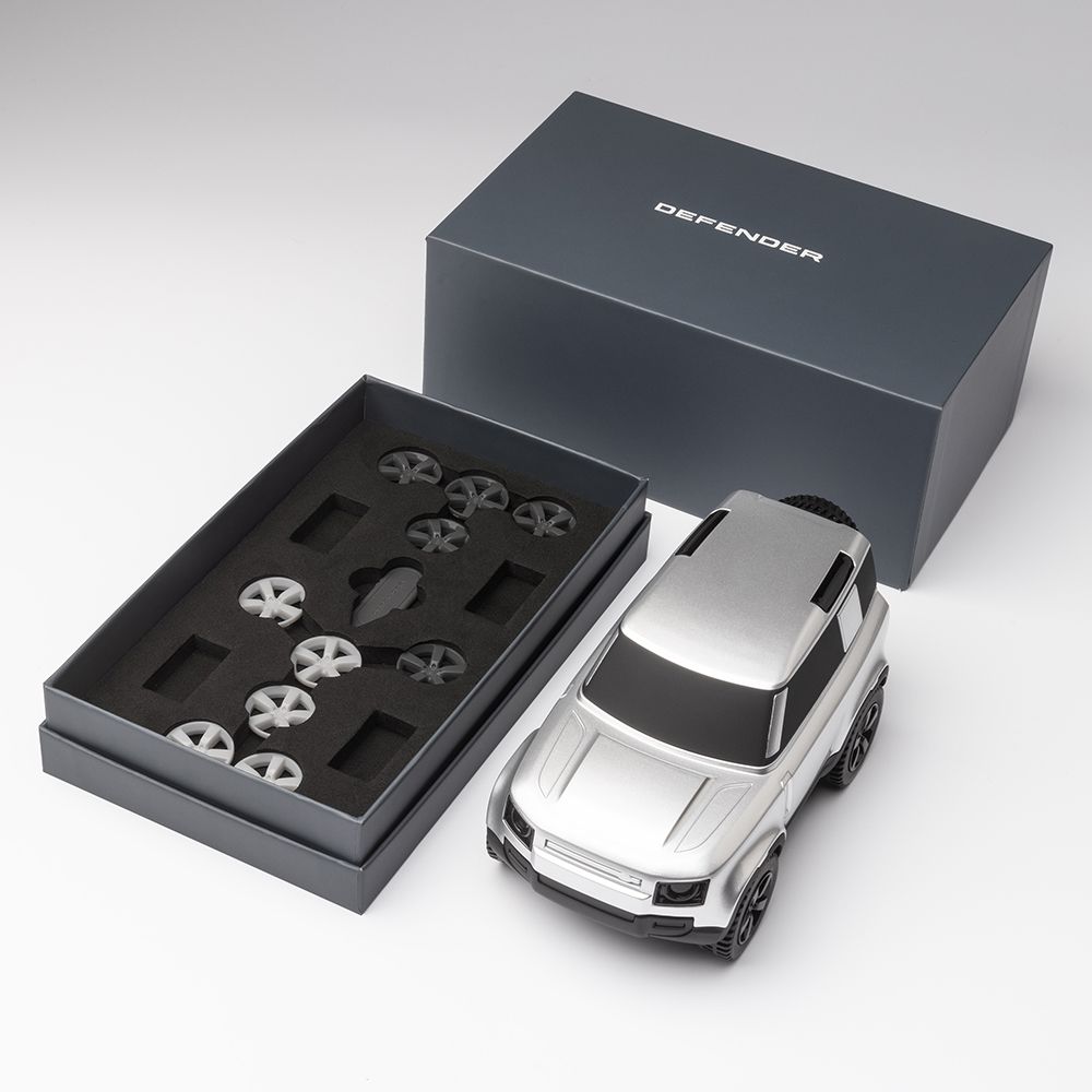 ハクバ・シルバーのディフェンダーアイコンモデル。完璧なフォルムと時代を超越したデザインで新しいディフェンダーを称えます。象徴的なヘッドライトとピラーのディテールが特徴です。